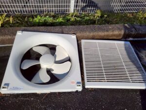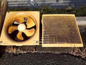 喫煙所に取り付けられた換気扇もこの通り、真っ白な状態に。