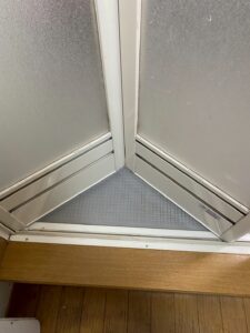 浴室内には湿気によるカビが発生しており、特に折れ戸部分には黒ずみが目立つ状態でした。